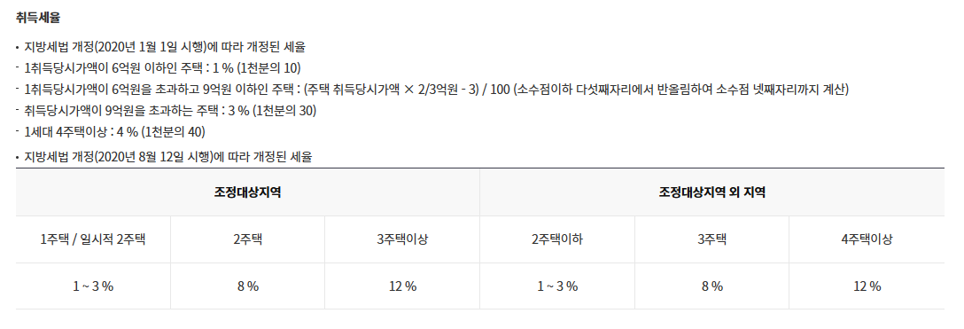 - 2주택자: 조정대상지역에서는 8%, 비조정지역에서는 4%