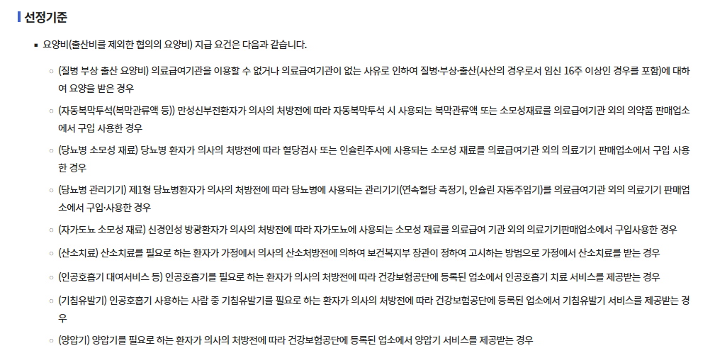 의료급여 요양비 지원 대상자는 일정한 조건을 충족해야 하는데요, 의료급여기관 이용이 불가능하거나 해당 기관이 없는 경우 의사의 처방에 따라 적합한 치료를 받은 경우에 해당합니다. 특정 질환 및 상태에 대한 진단기준과 검사항목을 충족한 경우 요양비 신청이 가능합니다.