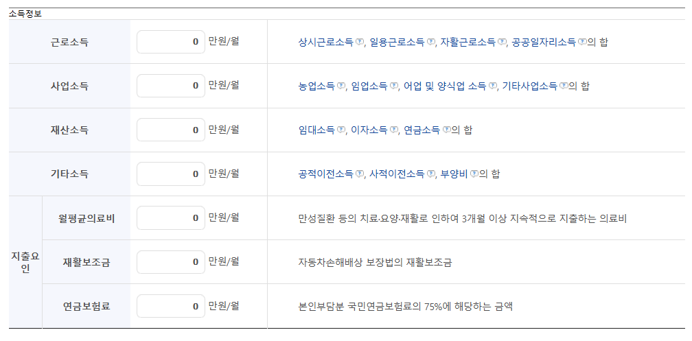 - 소득평가액: 실제 소득 - 필수 지출비용 - 근로소득 공제 재산의