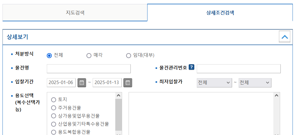 공매 물건의 최저 입찰가는 해당 물건의 시작 가격을 나타냅니다. "전체"를 선택하여 최저 입찰가를 설정하면 모든 물건을 검색할 수 있습니다. 가격대가 중요한 경우 원하는 가격 범위로 설정하여 검색할 수도 있습니다.
