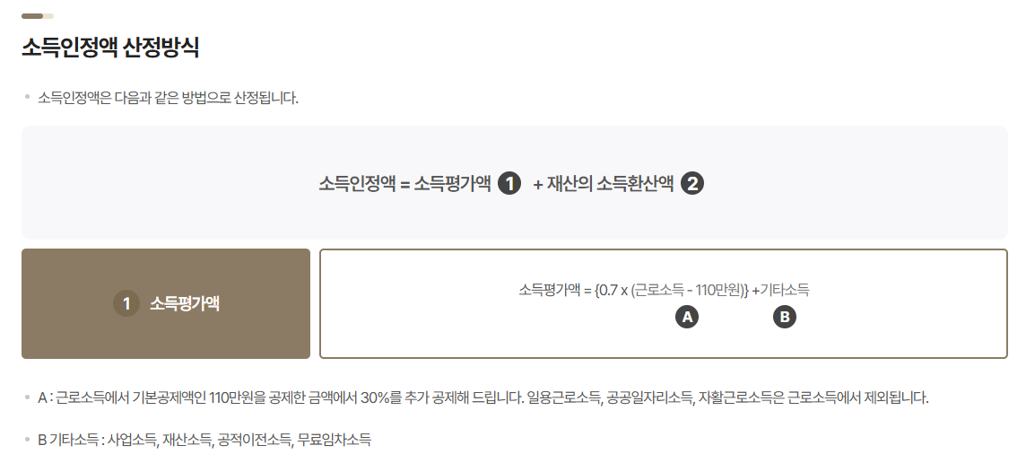 소득평가액은 근로소득, 사업소득, 공적 이전 소득 등을 포함하며, 소득평가액 = 0.7 × (근로소득 - 110만 원) + 기타소득 재산의 소득환산액으로 공식을 통해 계산됩니다