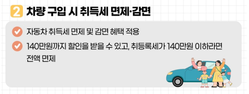 2024년 12월 31일까지 다자녀 가구가 차량을 취득할 경우, 한 대에 한해 취득세가 면제됩니다. 7인 미만 승용차의 경우 최대 140만원까지 면제 또는 감면이 가능합니다.