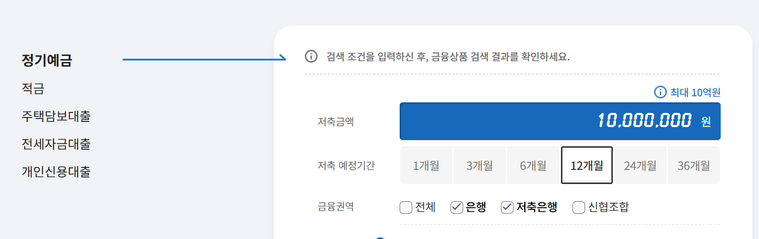 원하는 예금 기간과 조건을 입력하여 검색합니다.