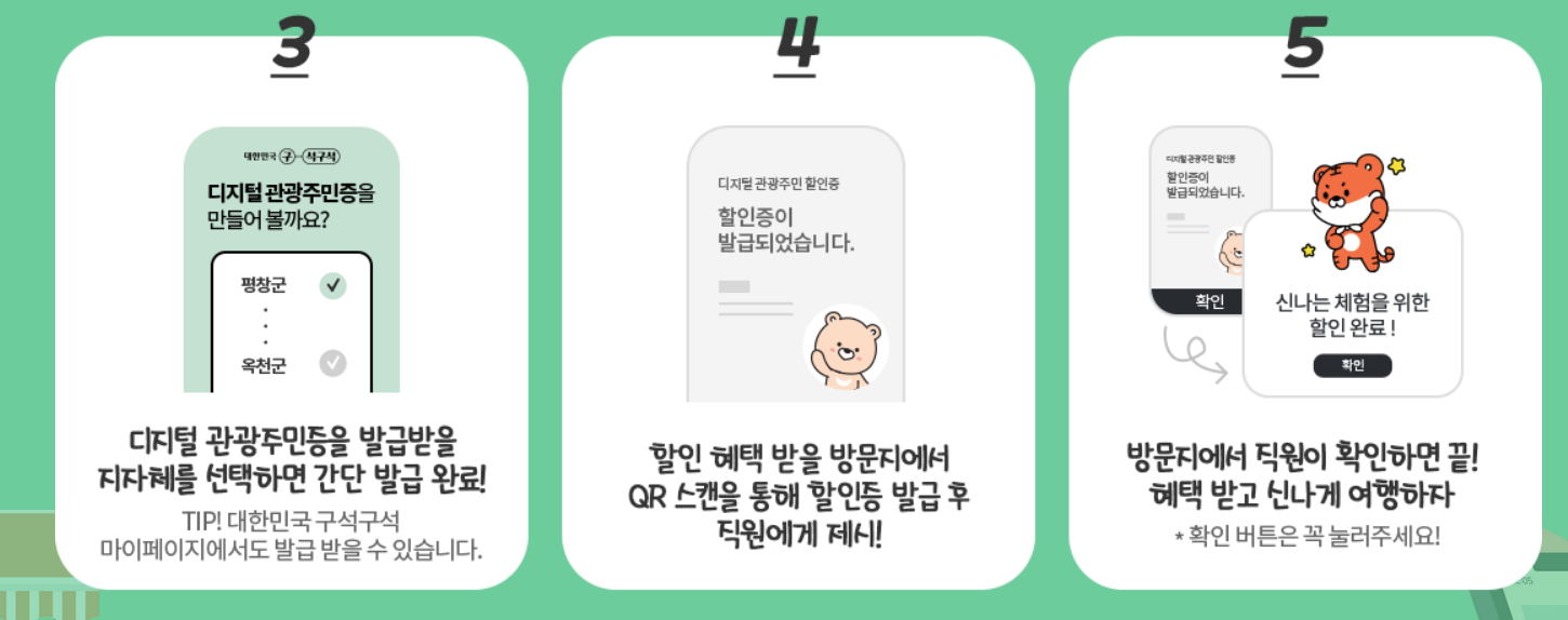 지역 특산품을 구매하거나 관광 프로그램을 예약할 때 디지털 관광주민증을 사용하면 할인이나 적립 혜택을 누릴 수 있습니다.