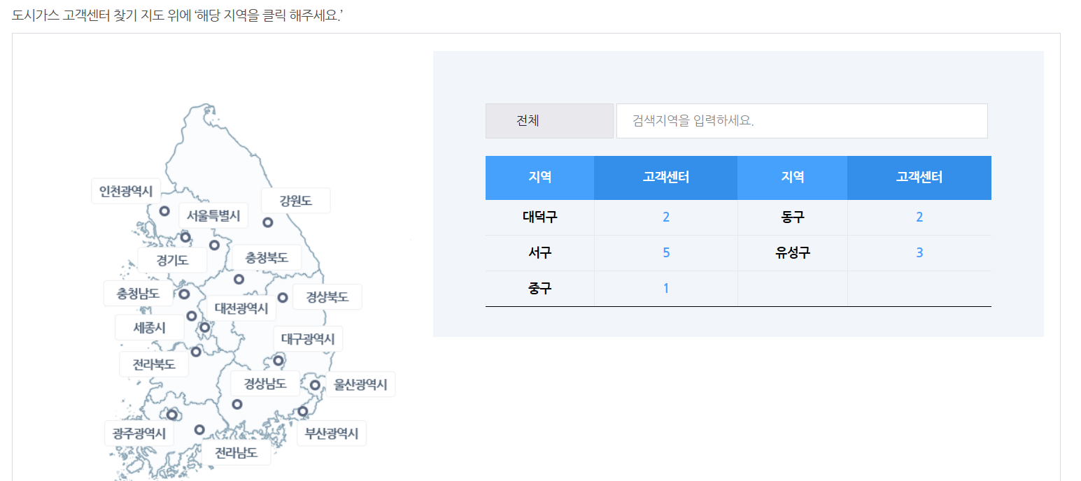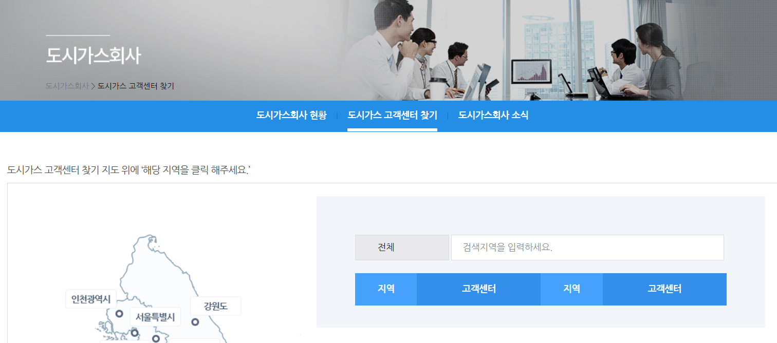 각 지역 도시가스 회사의 웹사이트에 접속하면 "고객센터 찾기" 메뉴를 통해 가까운 지점의 위치와 연락처를 확인할 수 있습니다. 검색 시, 거주 지역을 입력하면 가장 가까운 센터를 안내받을 수 있습니다.
