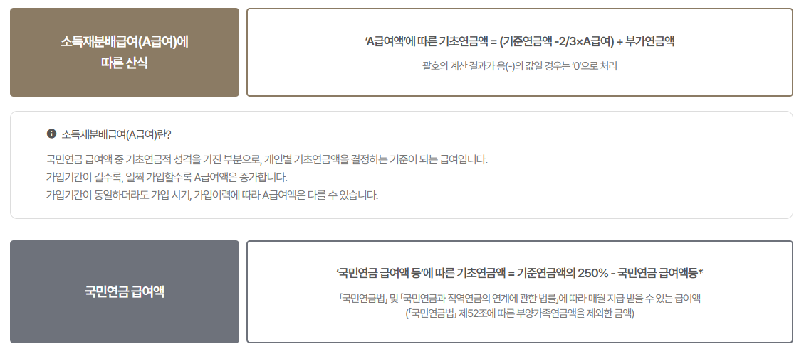 기본연금액 = (A값 × 평균소득대체율 × 가입기간) + 부가연금액