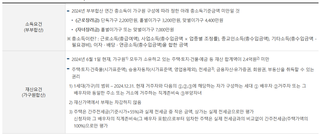 가구의 재산 합계가 2억 4천만 원 미만이어야 합니다.