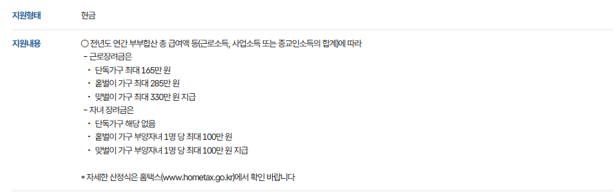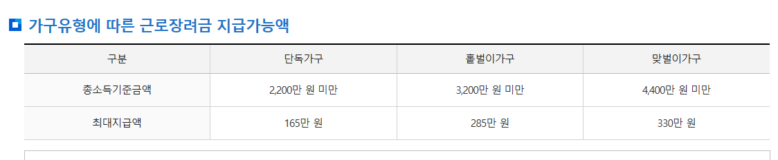 근로장려금 신청 대상자는 가구 유형에 따라 소득 요건이 달라집니다.