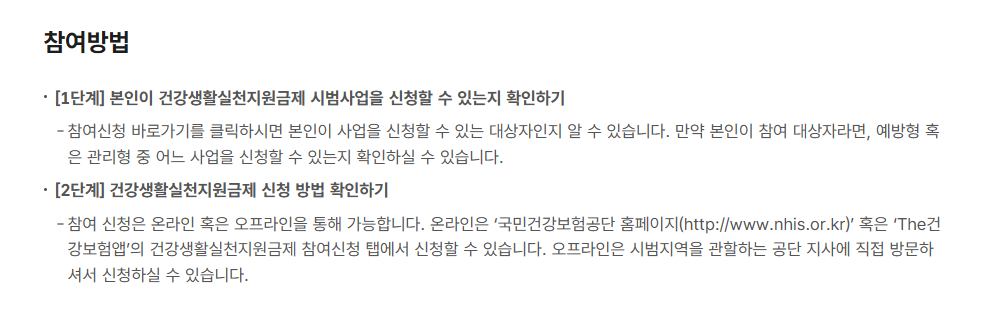 먼저 본인이 건강생활실천지원금제 시범사업에 참여할 수 있는 대상자인지 확인해야 합니다. 만약 참여 대상자라면, 자신이 신청할 수 있는 사업이 예방형인지 관리형인지 확인할 수 있습니다.
