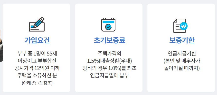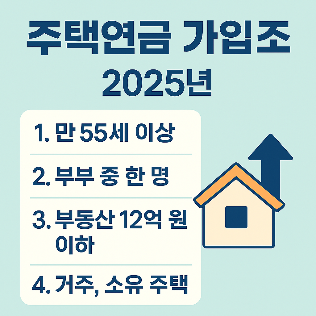 가입자는 만 55세 이상(2024년까지는 60세 이상이었으나, 2025년부터 완화됨)이어야 하며, 부부 공동명의의 경우 두 사람 중 한 명이 조건을 충족하면 됩니다.