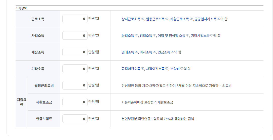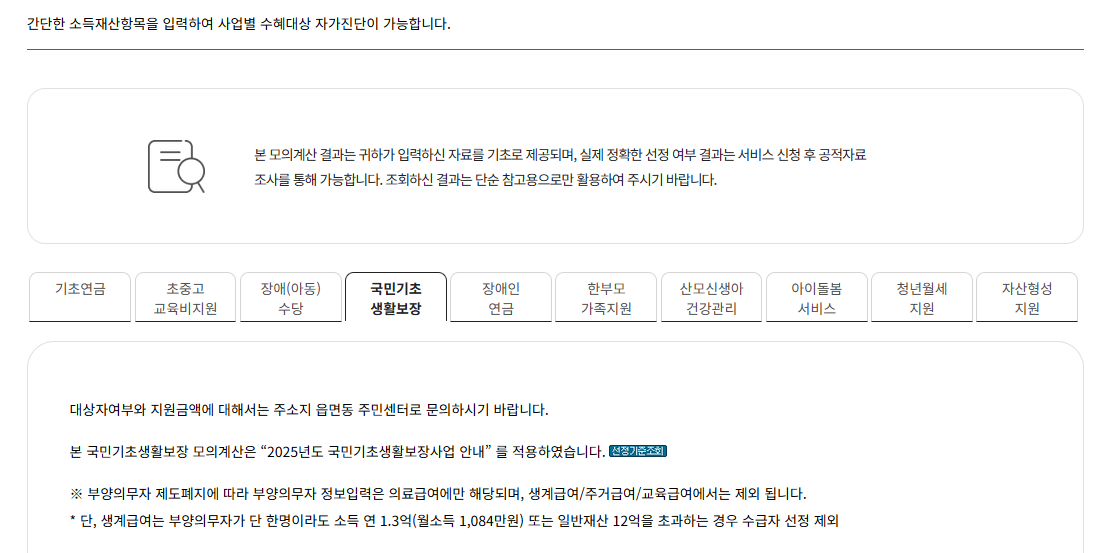 - 가구 구성, 소득, 재산 등을 입력하여 차상위 여부 확인 가능