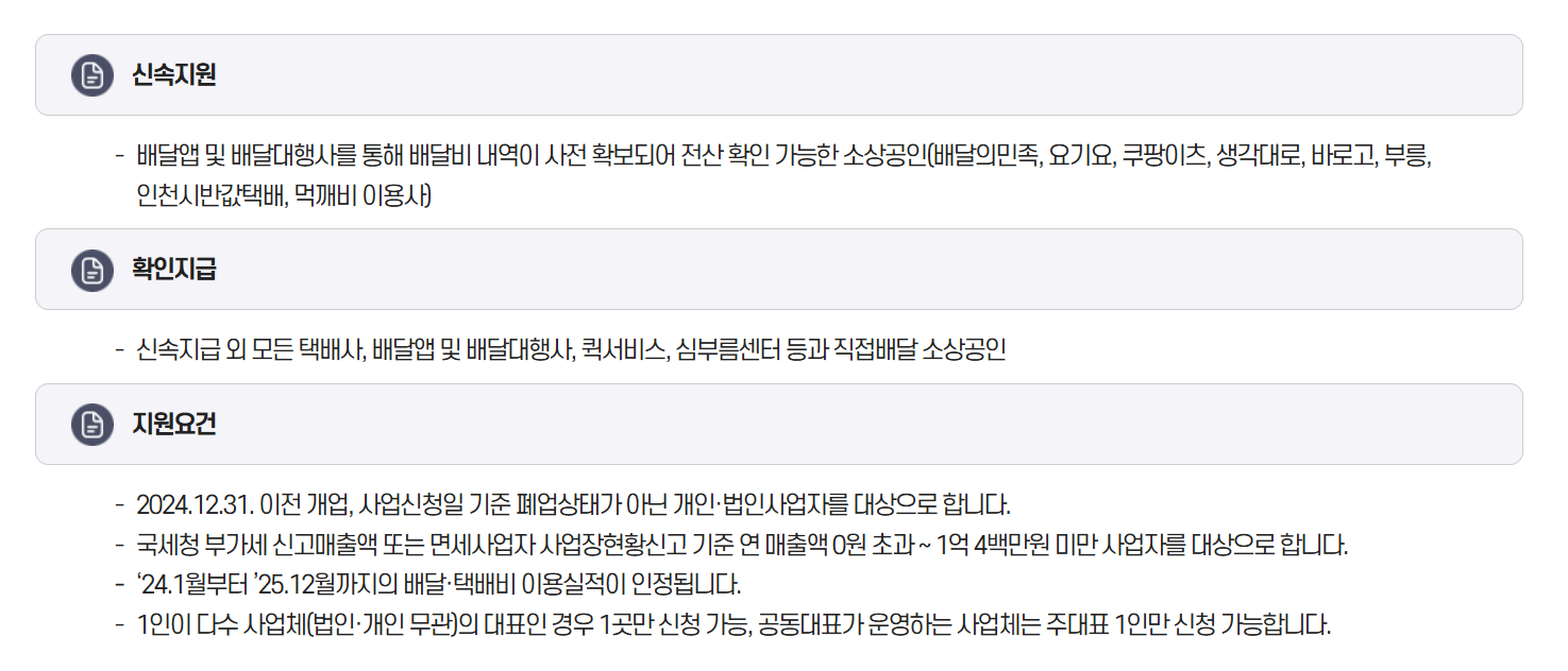 이번 배달·택배비 지원사업의 확인지급 대상은 다음과 같은 조건을 모두 충족해야 합니다.