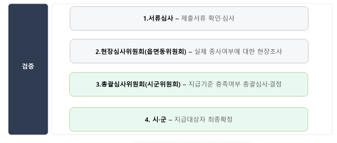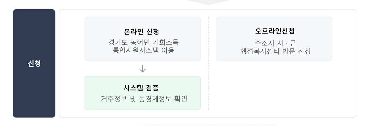 - 필수서류 제출 (신청서, 신분증, 통장 사본, 농업경영체 등록증 등)