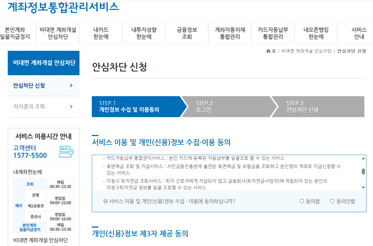 '정보통합관리서비스'로 잘 알려진 '어카운트인포(Account Info)'를 통해 비대면 계좌 개설 차단을 신청할 수 있습니다. 이는 금융결제원이 운영하는 공신력 있는 서비스로, PC나 스마트폰 앱 모두에서 사용이 가능합니다.