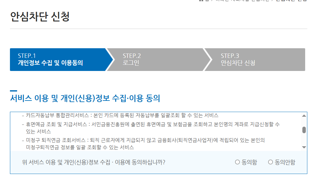 거래 중인 은행이나 증권사의 앱이나 홈페이지에서도 해당 서비스 신청이 가능합니다. 각 금융기관의 모바일 뱅킹 앱에 로그인한 후, [고객센터] 또는 [보안서비스] 메뉴에서 '개설 차단' 항목을 선택하시면 됩니다.