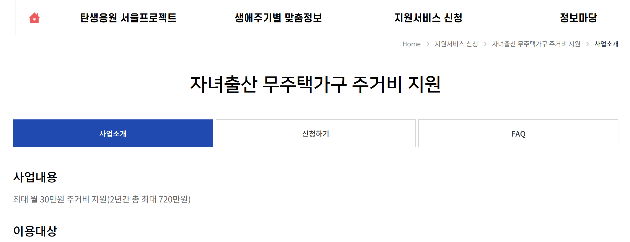 출산을 앞두었거나 갓 자녀를 출산한 서울시 무주택 가구라면, 이번 기회를 통해 최대 720만 원의 주거비 지원 혜택을 꼭 받아보시길 바랍니다.