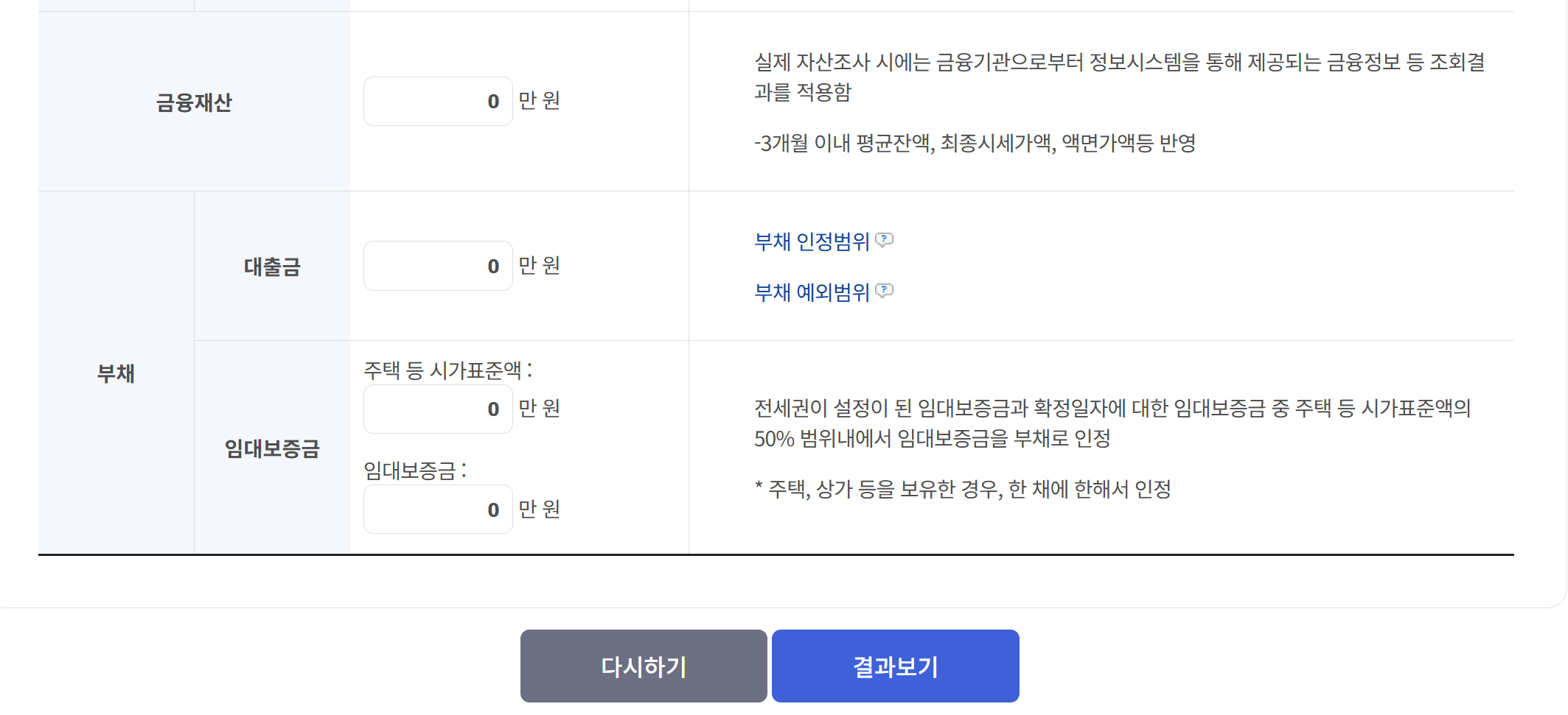 - 정확한 결과를 위해 소득, 재산, 부채, 공제 항목을 최신 기준으로 입력