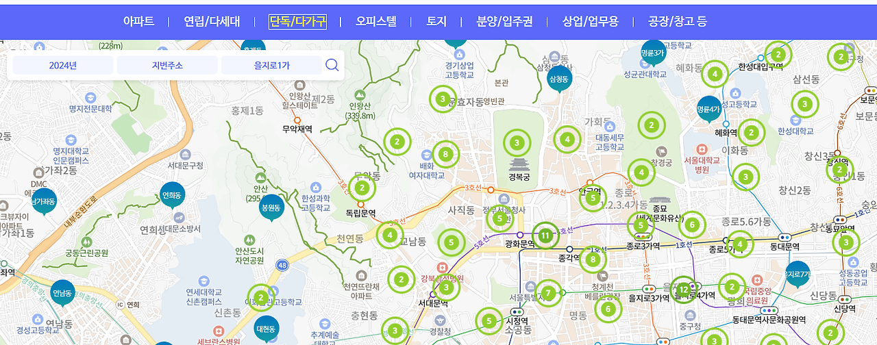 사이트 상단 메뉴에서 매매 또는 전월세를 선택합니다. 이때, 조회하려는 유형에 따라 아파트, 오피스텔, 단독주택 등을 선택할 수 있습니다.